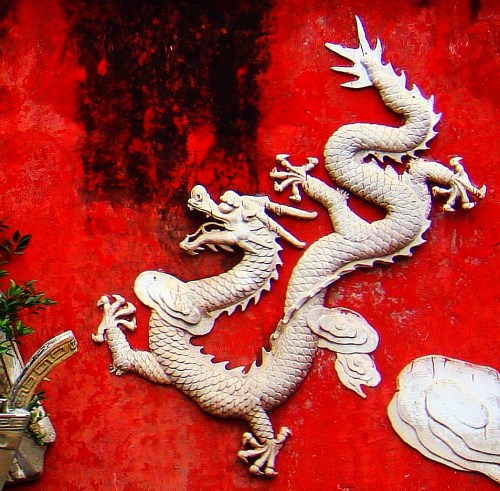 In Asian mythology and artwork†, dragons look a bit different, with Chinese, Japanese, Korean, and Vietnamese dragons most often appearing as long, serpentine creatures with four legs and no wings—though many are capable of flight still. Their facial features are also fairly distinctive, almost mammal-like, sometimes with fur, colorful scales, and/or long whiskers. Chinese dragons are the oldest among these, with depictions of dragons appearing on artifacts from the Shang and Zhou dynasties and back to the 16th century BCE. The Chinese name for dragon is pronounced lóng in Mandarin Chinese or lùhng in Cantonese, which is thought by some historians to be an onomatopoeia of the sound of thunder.
