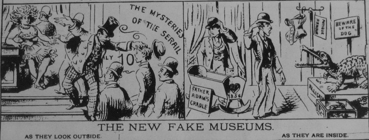 They were also, often as not, pretty scammy and lacking in real educational value, as the 1889 comic (above) from The Mascott New Orleans newspaper suggests. Austin’s was technically a half-dime museum, costing only a nickel to get in—hence the name.