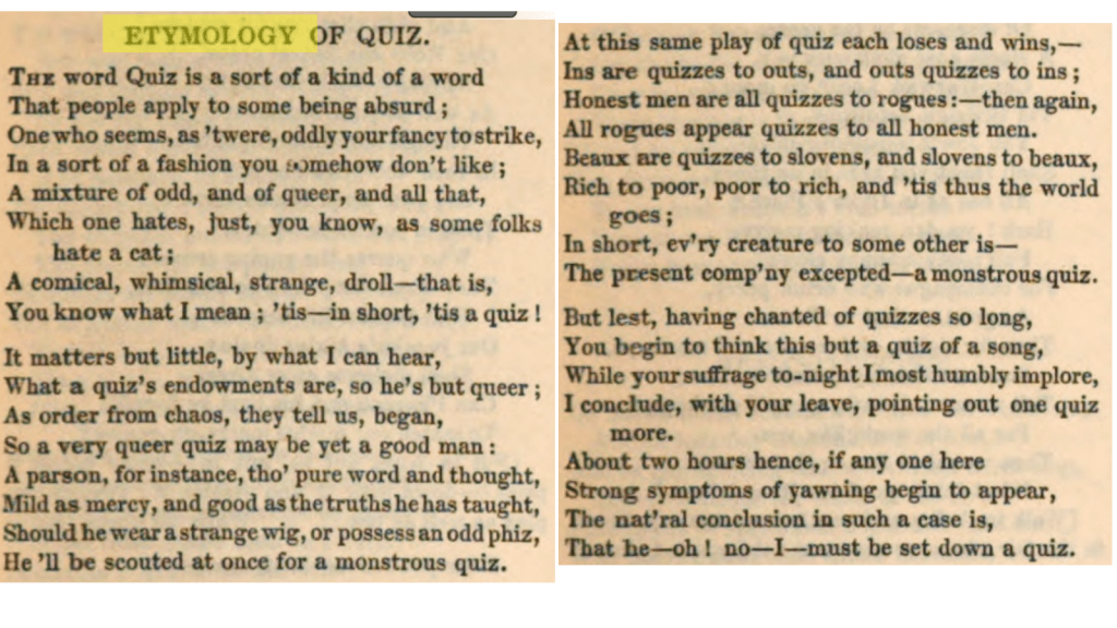 There’s also a song literally called “The Etymology of Quiz,” by Charles Dibdin from the mid-1800s. It doesn’t actually describe any etymology, but it gives a variety of meanings for the word quiz, saying that anyone or anything odd, comical, strange or droll—including the song itself—might be called a quiz.