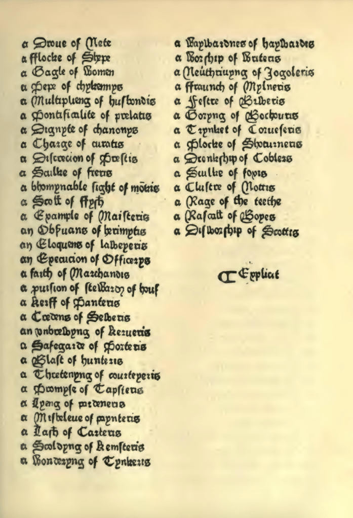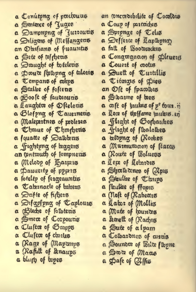 The book contains about 150 collective nouns, including what may be the first recorded instances of phrases like “gaggle of geese” and “pride of lions,” and “litters” of baby animals, terms meant to be imitative of the behavior of the animals they describe.