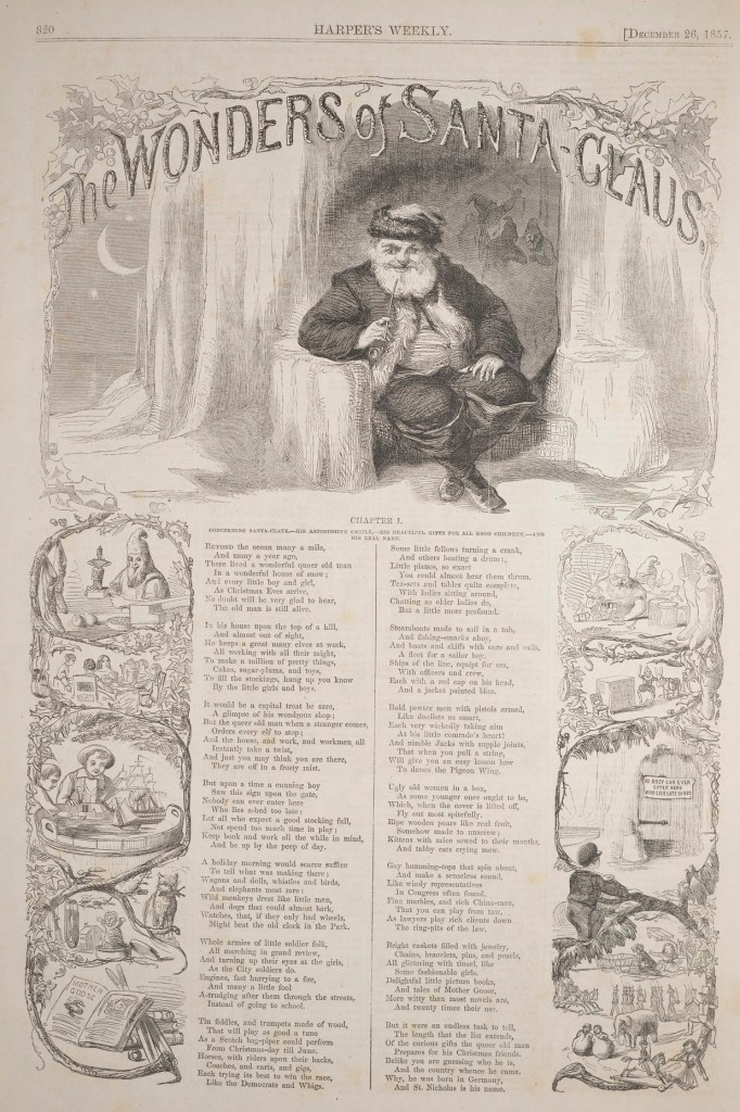 In 1857, Harper’s Weekly published an uncredited poem called “The Wonders of Santa Claus,” which details Santa’s workshop: